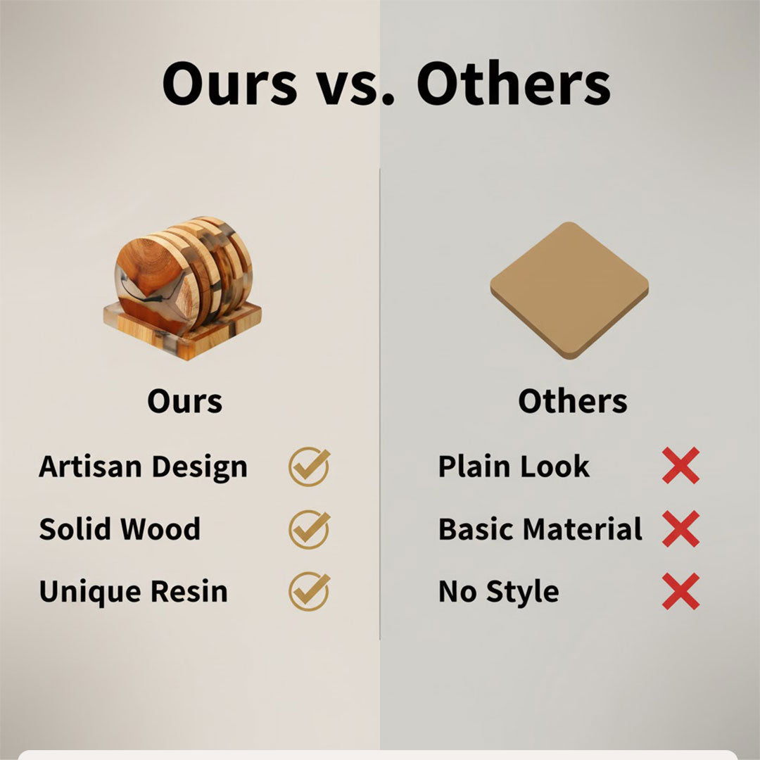 A: The coasters are made from solid wood with resin accents for a unique blend of textures and design.